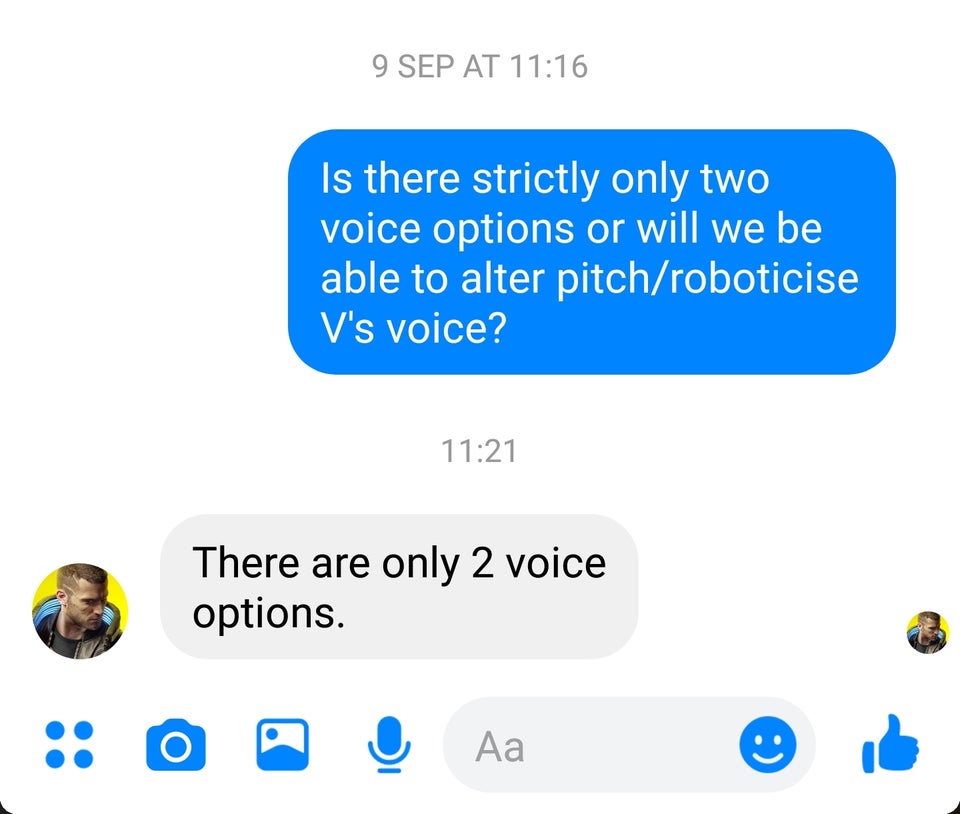 Отвечая на вопрос пользователя в одной из соцсетей, представители CD Projekt RED заявили, что в Cyberpunk 2077 будет доступно только 2 вариации голоса. Вероятно, это будут просто мужской и женский голоса, а точнее более высокий и более низкий, учитывая гендерную политику игры.